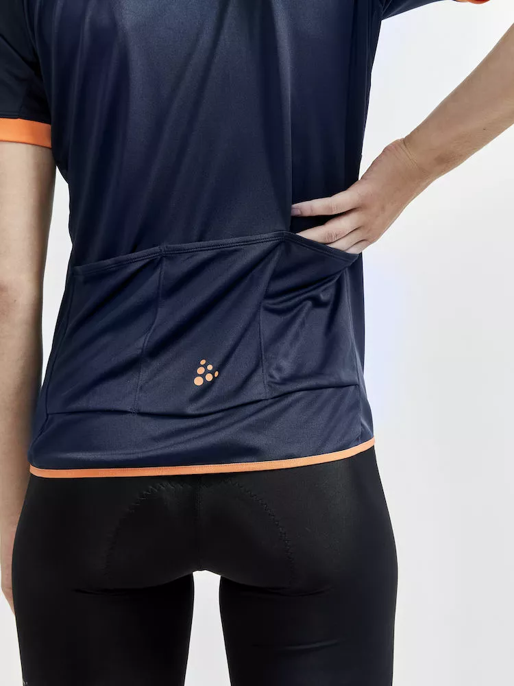 Kortærmet cykeltrøje til kvinder som er lavet i strækbart genbrugs polyester. Trøjen er svedtransporterende og i blødt materiale for stor komfort. Trøjen er designet med tre baglommer og en lynlås der går hele vejen ned.