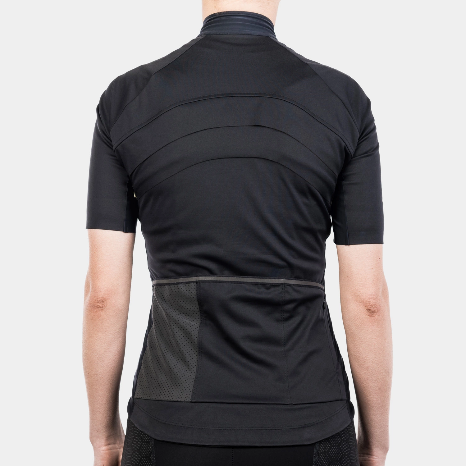 Fire åbninger i den forreste del af trøjen beskyttet af skjulte lynlåse giver dig mulighed for at ventilere efter behov, mens to skjulte bagklapper på tværs af skuldrene fungerer som udstødningsgæller for at lade kropsvarmen undslippe. Brugte stoffer er lette og åndbare stoffer, men samtidig vandafvisende og vindtæt. Jersey har minimum branding, og stærkt fokus er på produkternes levetid.